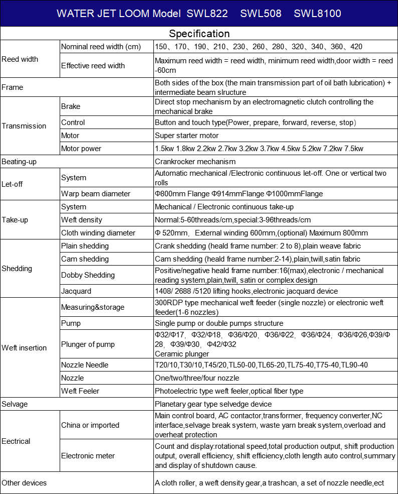 SWL822 design based on Tsuda Koma ZW-303 series water-jet loom,which is optimizing the main component and frame structure,improving the beating-up,let-off mechanism and take-up mechanism,installing assistant device on let-off mechanism,all of this ensure the running stably and reduce vibration and noise,increase efficiency and enlarge the weaving range.